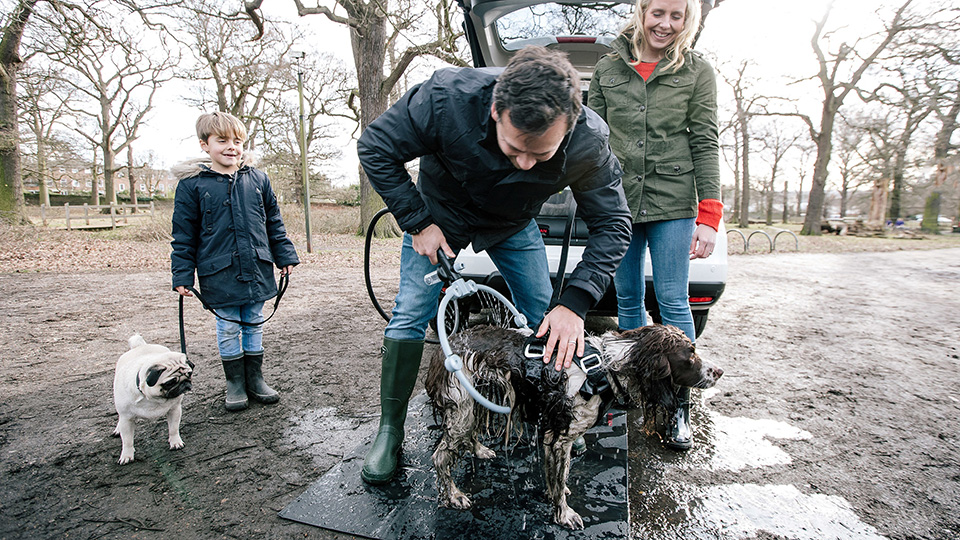 При этом поилка, кормушка и «кровать» для собак легко вынимаются из багажника, что обеспечивает обычно грузовое пространство, например, для поездки по магазинам. Также открывается доступ к запасному колесу.